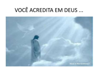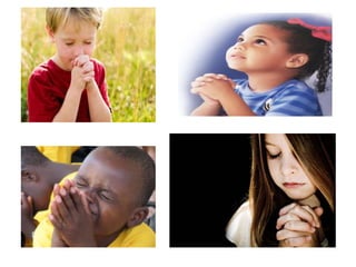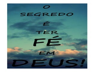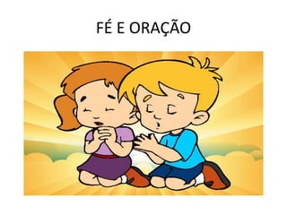 O documento discute a fé em Deus e a oração. Ele explica que embora não possamos ver Deus, devemos acreditar que Ele existe e nos escuta, e que a oração com fé é a forma de pedir ajuda e agradecer a Deus por Sua proteção e criações.