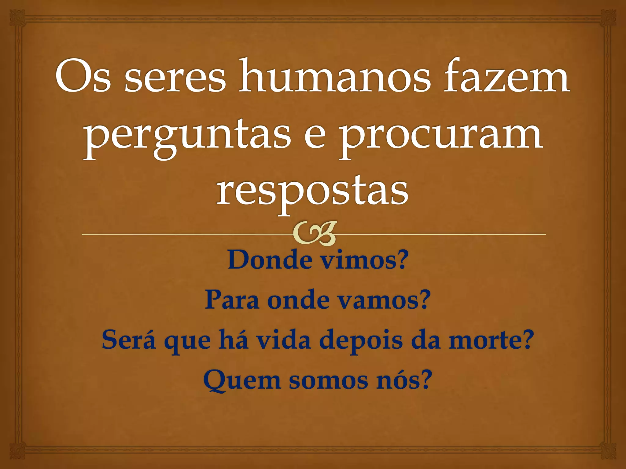 Este documento discute as perspectivas da ciência e da religião sobre questões fundamentais da existência humana. A ciência procura respostas através do método científico, mas não pode responder a todas as perguntas. As religiões fornecem respostas baseadas na fé, como a origem do homem e do universo e a possibilidade de vida após a morte.