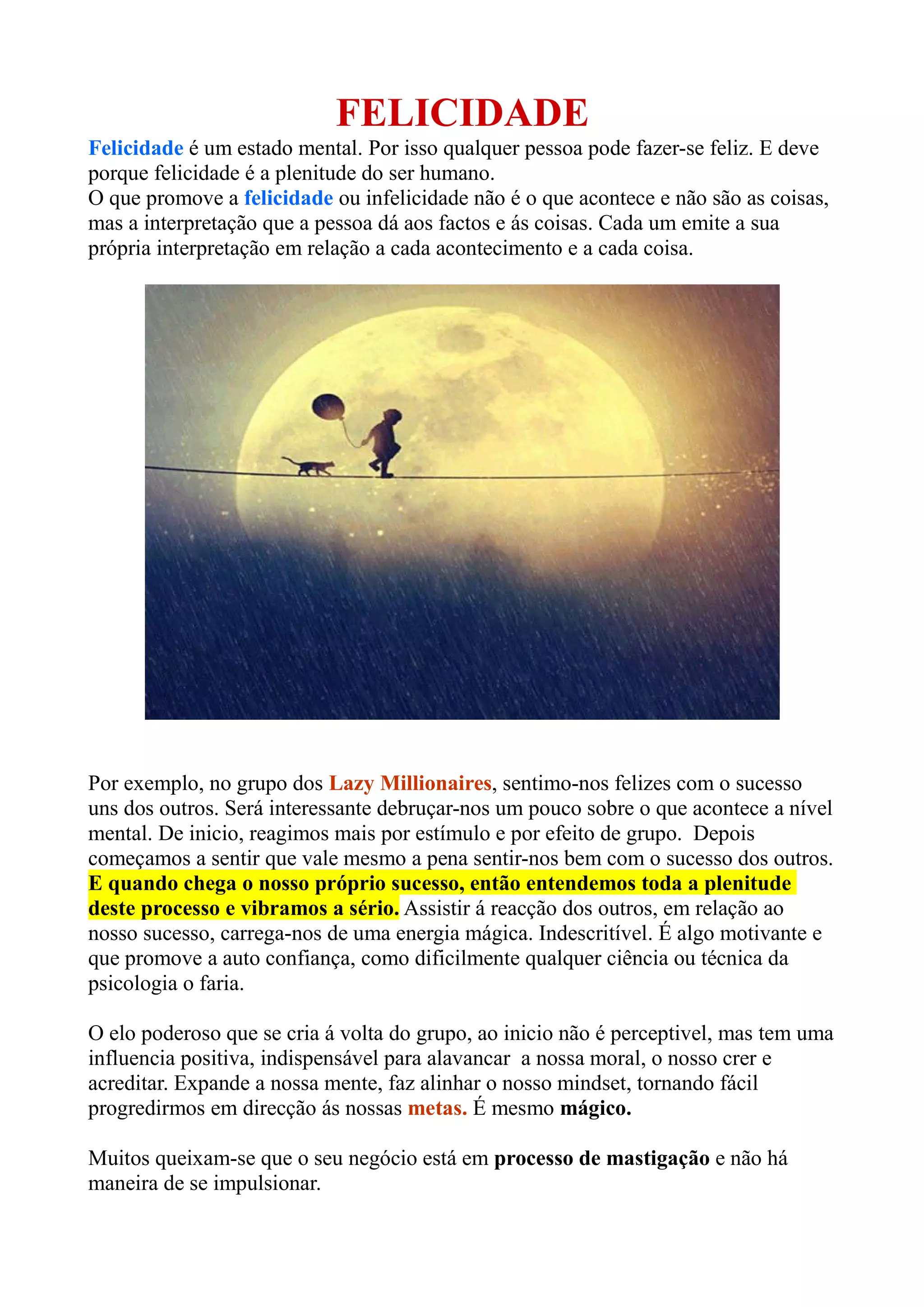 O documento discute a felicidade como um estado mental que qualquer pessoa pode alcançar. A felicidade vem da interpretação positiva dos fatos e não dos fatos em si. Fazer parte de um grupo onde as pessoas comemoram o sucesso umas das outras promove felicidade, autoconfiança e motivação através de um elo poderoso. Acreditar plenamente no próprio potencial é essencial para alcançar o sucesso desejado.