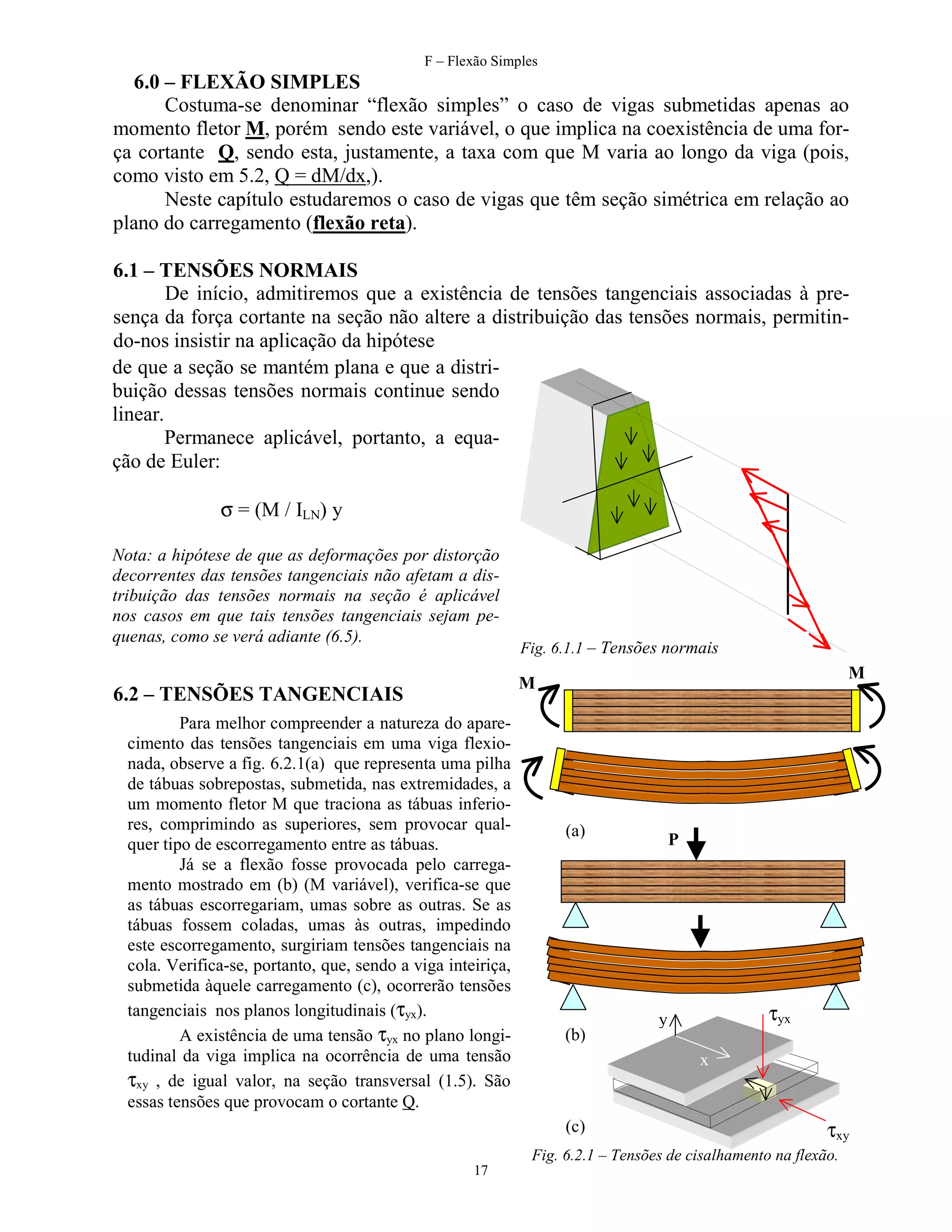 Este documento descreve os conceitos de flexão simples em vigas. A flexão simples ocorre quando uma viga é submetida apenas a um momento fletor variável ao longo dela, gerando tensões normais e tangenciais. As tensões normais seguem a equação de Euler e têm distribuição linear. Já as tensões tangenciais surgem devido à variação do momento fletor e seguem a equação de Jourawsky, com distribuição não linear na seção transversal. Exemplos demonstram o cálculo destas tensões em diferentes formatos de