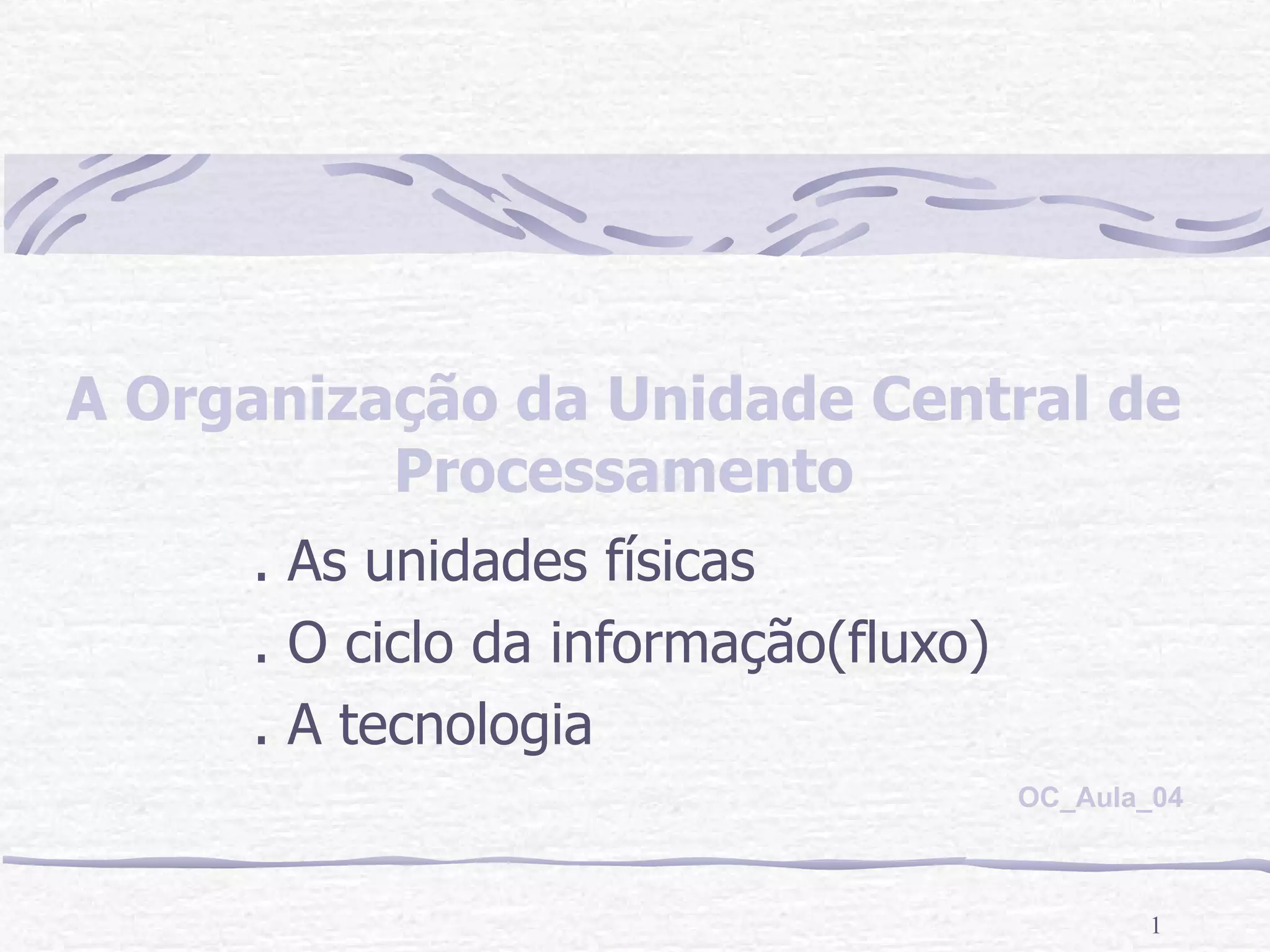 O documento discute a organização da unidade central de processamento e formas de paralelismo em computadores. Resume três formas principais de paralelismo: (1) no nível das instruções, executando múltiplas instruções simultaneamente em pipelines; (2) no nível do processador, usando múltiplos processadores; (3) no nível do sistema, conectando vários computadores para solucionar problemas em paralelo.