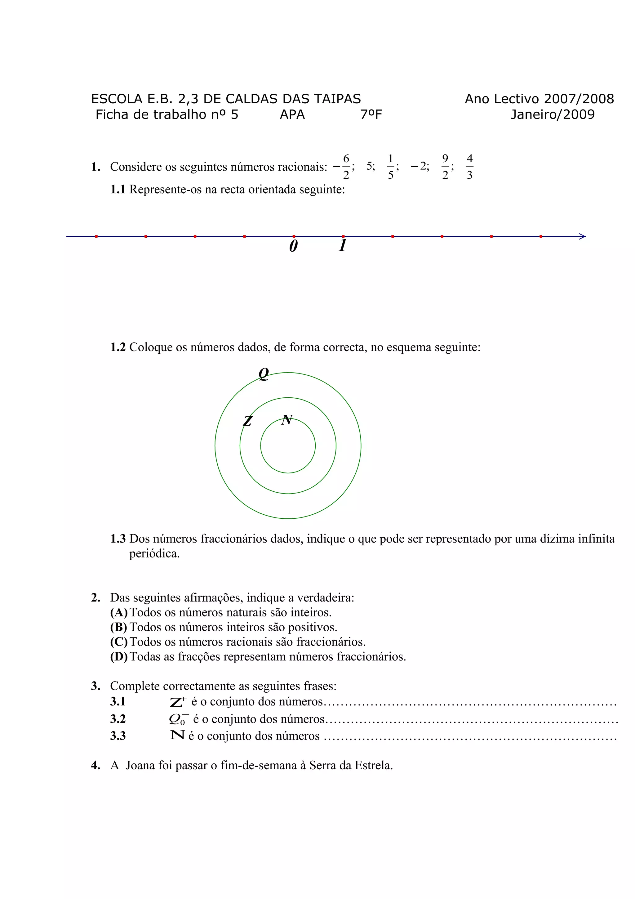 O documento apresenta uma série de exercícios matemáticos relacionados com números racionais, inteiros e naturais. Inclui representações de números na reta numérica, identificação de afirmações verdadeiras, preenchimento de frases com conjuntos numéricos, resolução de problemas de temperatura e cálculos matemáticos.