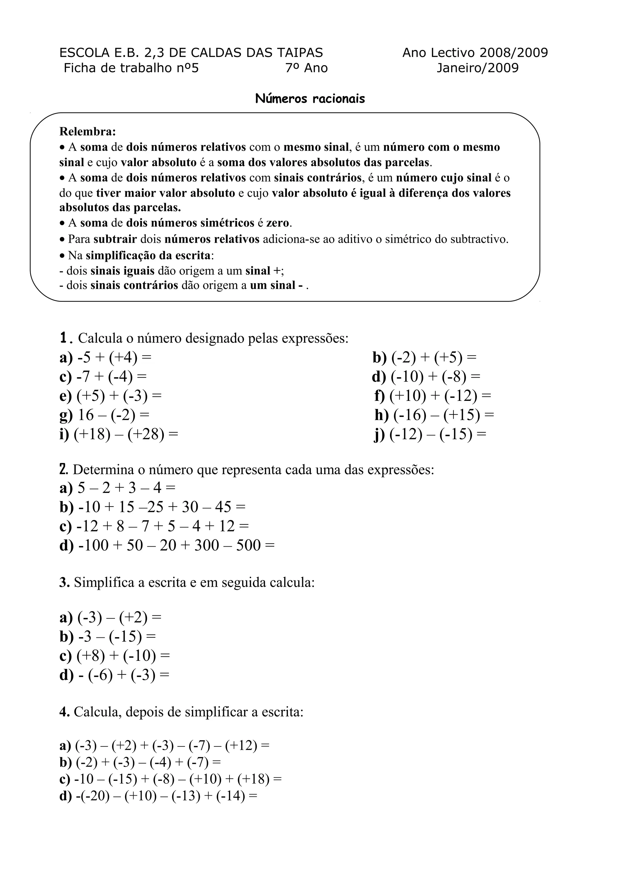 1) O documento apresenta regras para somar e subtrair números relativos e racionais, incluindo a soma de números com o mesmo e diferente sinal e a redução de expressões. 2) São fornecidos exercícios de cálculo envolvendo a soma, subtração e simplificação de expressões com números relativos e racionais. 3) As regras para somar ou subtrair números inteiros relativos se aplicam também aos números racionais, e frações devem ter o mesmo denominador antes de somar ou subtrair.
