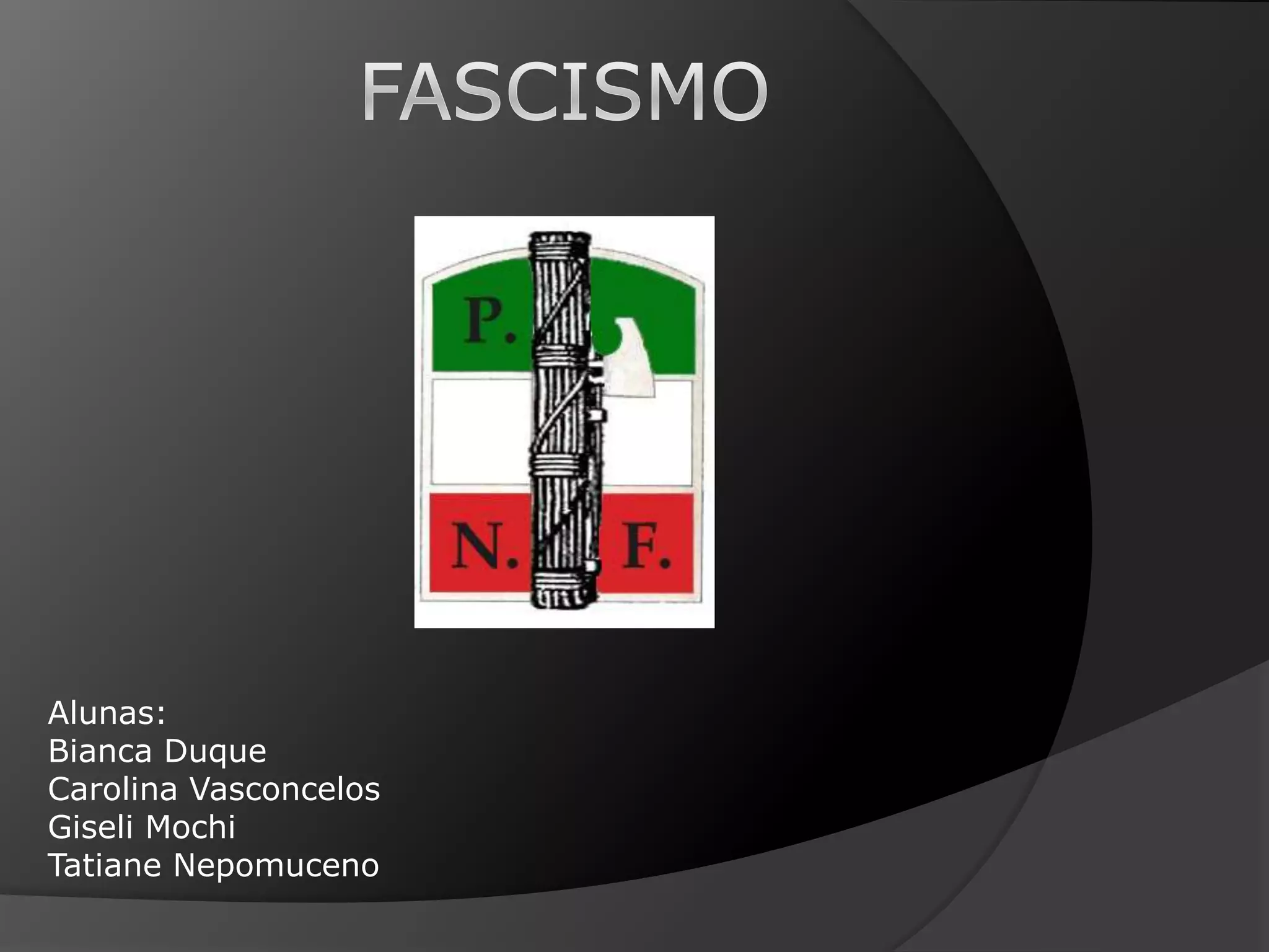 O fascismo é uma doutrina totalitária desenvolvida por Mussolini na Itália que se opõe a liberalismos, socialismo e democracias. Surgiu após a Primeira Guerra Mundial em países em crise econômica. Caracteriza-se pelo totalitarismo, nacionalismo, militarismo e anti-socialismo. No Brasil, instalou-se na comunidade italiana e se fortaleceu com a Aliança Integralista e o regime de Getúlio Vargas.