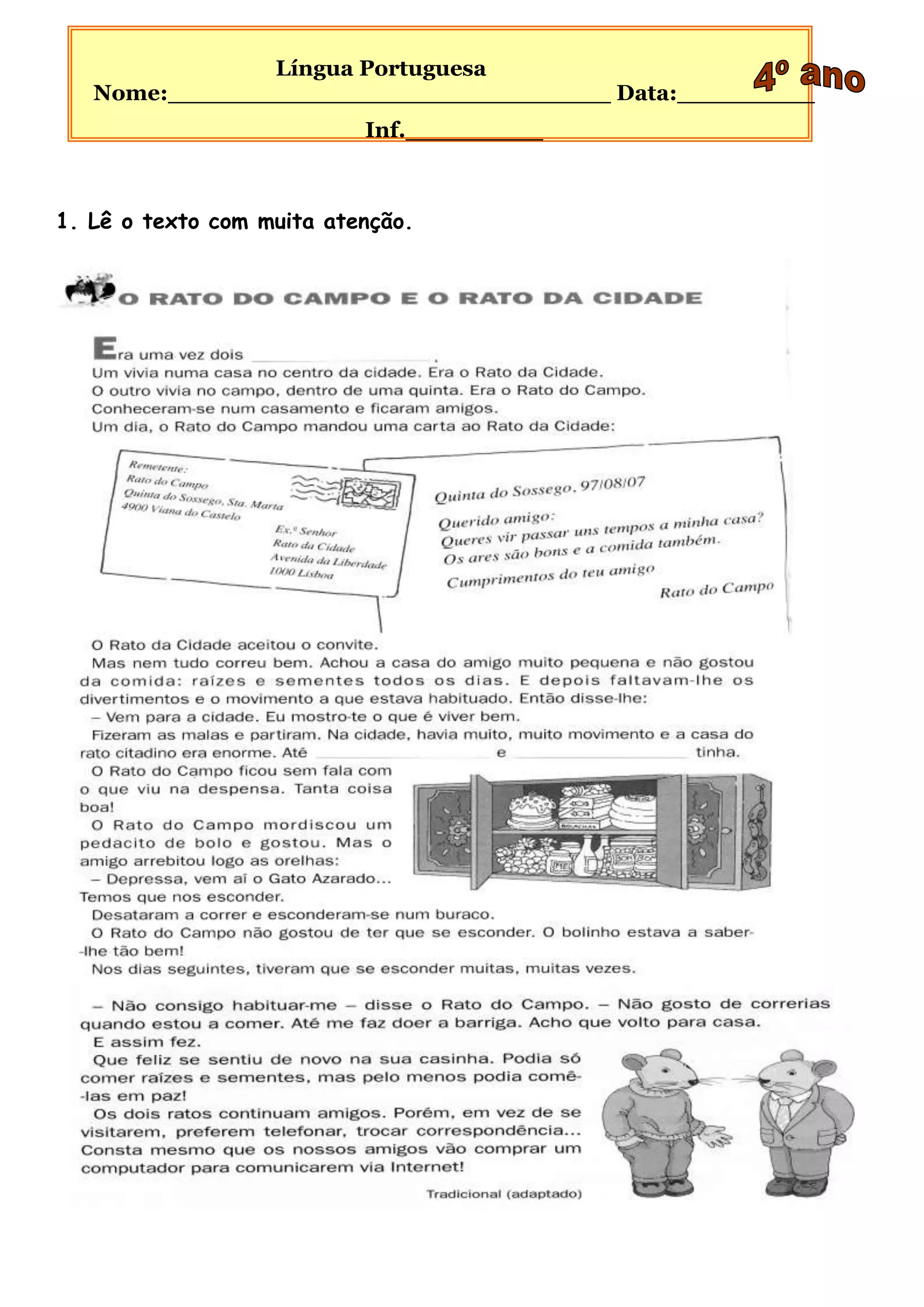 Este documento é um teste sobre um texto que conta a história de um rato do campo e um rato da cidade que se tornaram amigos. O teste contém perguntas sobre detalhes da narrativa, como onde os ratos vivem e se conheceram, e pede ao aluno para identificar elementos gramaticais como grupos nominais e verbais.
