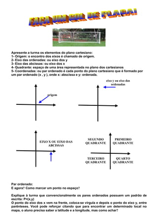 O documento apresenta os elementos básicos do plano cartesiano: a origem, os eixos x e y, os quadrantes, as coordenadas de pontos como pares ordenados (x,y), e desafia os alunos a marcarem pontos no plano cartesiano escolhendo entre várias opções de coordenadas fornecidas.