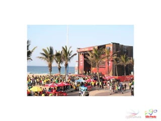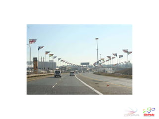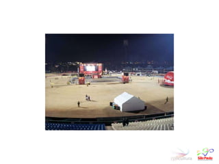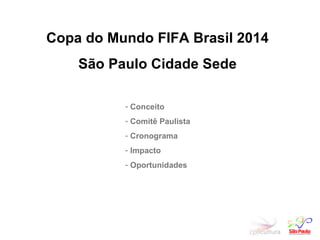 Este documento discute a Copa do Mundo FIFA de 2014 no Brasil, com foco em São Paulo como cidade sede. Ele fornece informações sobre (1) o comitê organizador paulista, (2) os impactos econômicos e sociais esperados da Copa, e (3) os principais desafios e estratégias para a organização do evento em São Paulo.