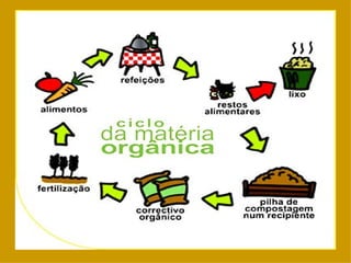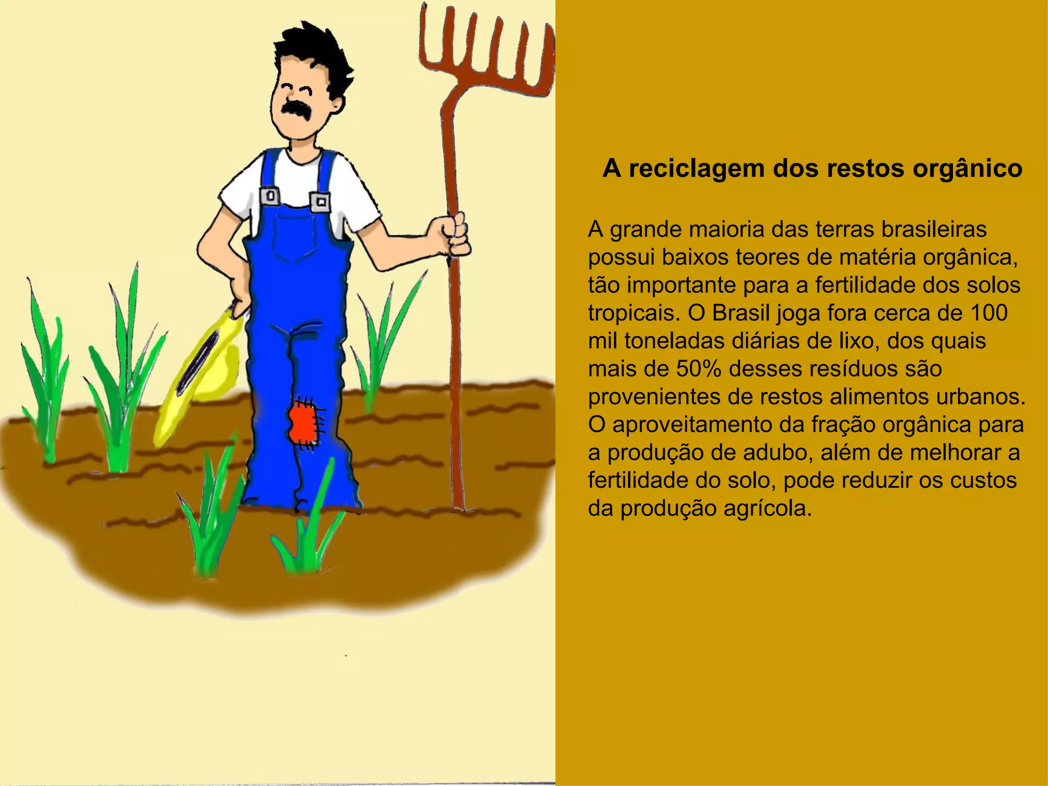 O documento discute a importância da reciclagem dos resíduos orgânicos no Brasil para aumentar a fertilidade dos solos e reduzir custos na agricultura. Mais de 50% do lixo urbano brasileiro é composto por restos de alimentos, que podem ser aproveitados como adubo através de processos como compostagem. A coleta seletiva e a triagem são etapas essenciais para direcionar esses resíduos à reciclagem e produção de fertilizante orgânico.