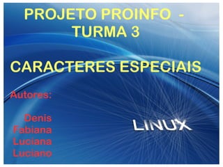 Este documento fornece uma introdução sobre caracteres especiais, mostrando exemplos de seus usos e instruções passo a passo para inseri-los em texto. Explica que caracteres especiais são símbolos e desenhos usados para enfeitar ou modificar texto, principalmente em bate-papos, e então lista vários exemplos comuns. Por fim, descreve os passos para acessar a caixa de diálogo de caracteres especiais e selecionar um para inserir.
