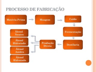 O documento descreve o processo de produção de álcool a partir da cana-de-açúcar, incluindo as etapas de moagem, produção de caldo, fermentação e destilação. Também discute os principais riscos à saúde e segurança em usinas de álcool, como incêndios, explosões, ruído e choques elétricos.