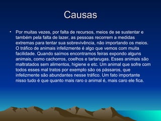 O documento discute as causas, consequências e ações para evitar o problema do tráfico de animais silvestres. As principais causas incluem a falta de recursos e lazer, levando as pessoas a medidas extremas para sobreviver. Uma consequência é a possível extinção de animais, prejudicando o equilíbrio ambiental. Devemos denunciar feiras clandestinas e ajudar os outros a não comprarem animais traficados.