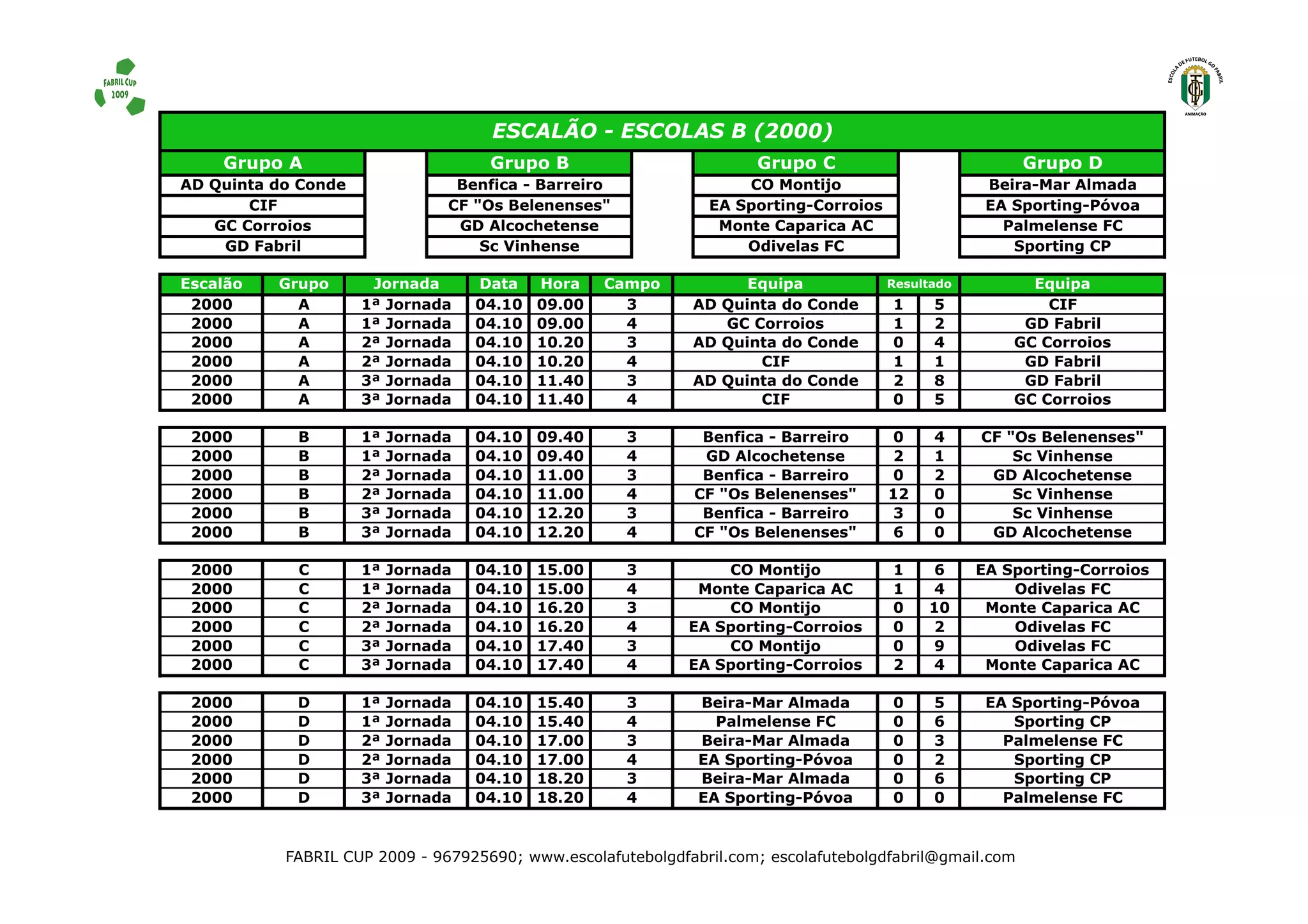 O documento apresenta o calendário de jogos de um campeonato escolar de futebol para o escalão de 2000. O campeonato é dividido em 4 grupos (A, B, C e D) e apresenta as equipes participantes de cada grupo, além das datas, horários e resultados dos jogos realizados nas 3 primeiras rodadas.