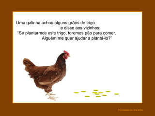 Uma galinha planta trigo sozinha e colhe os grãos sozinha, já que os vizinhos se recusam a ajudar. Ela coze cinco pães sozinha e os vizinhos reclamam que ela é egoísta por não dividir. Um funcionário do governo diz que ela deve pagar impostos e dividir seus ganhos com os vizinhos preguiçosos de acordo com as leis. No final, a galinha está grata e os vizinhos perguntam porque ela nunca mais fez pão.
