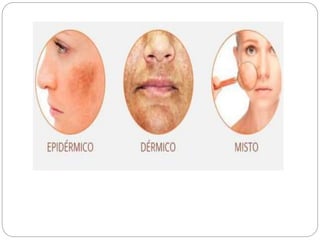 O documento discute principais afecções faciais tratadas por esteticistas, incluindo acne, rosácea, melasma e sinais de envelhecimento. A acne é classificada em 4 graus com base na gravidade dos sintomas, e o documento descreve cada grau e tipo. A rosácea causa vermelhidão facial e pode ser do tipo eritemato-telangectasia ou pápulo-pustular. O melasma causa manchas escuras no rosto devido a aumento de melanina. O envelhecimento da pe
