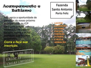 O documento anuncia um acampamento religioso na Fazenda Santo Antonio em Porto Feliz com atividades como louvor, adoração, batismo, piscina, tobogãs, futebol e animação, e encoraja as pessoas a se inscreverem para não perderem a oportunidade.