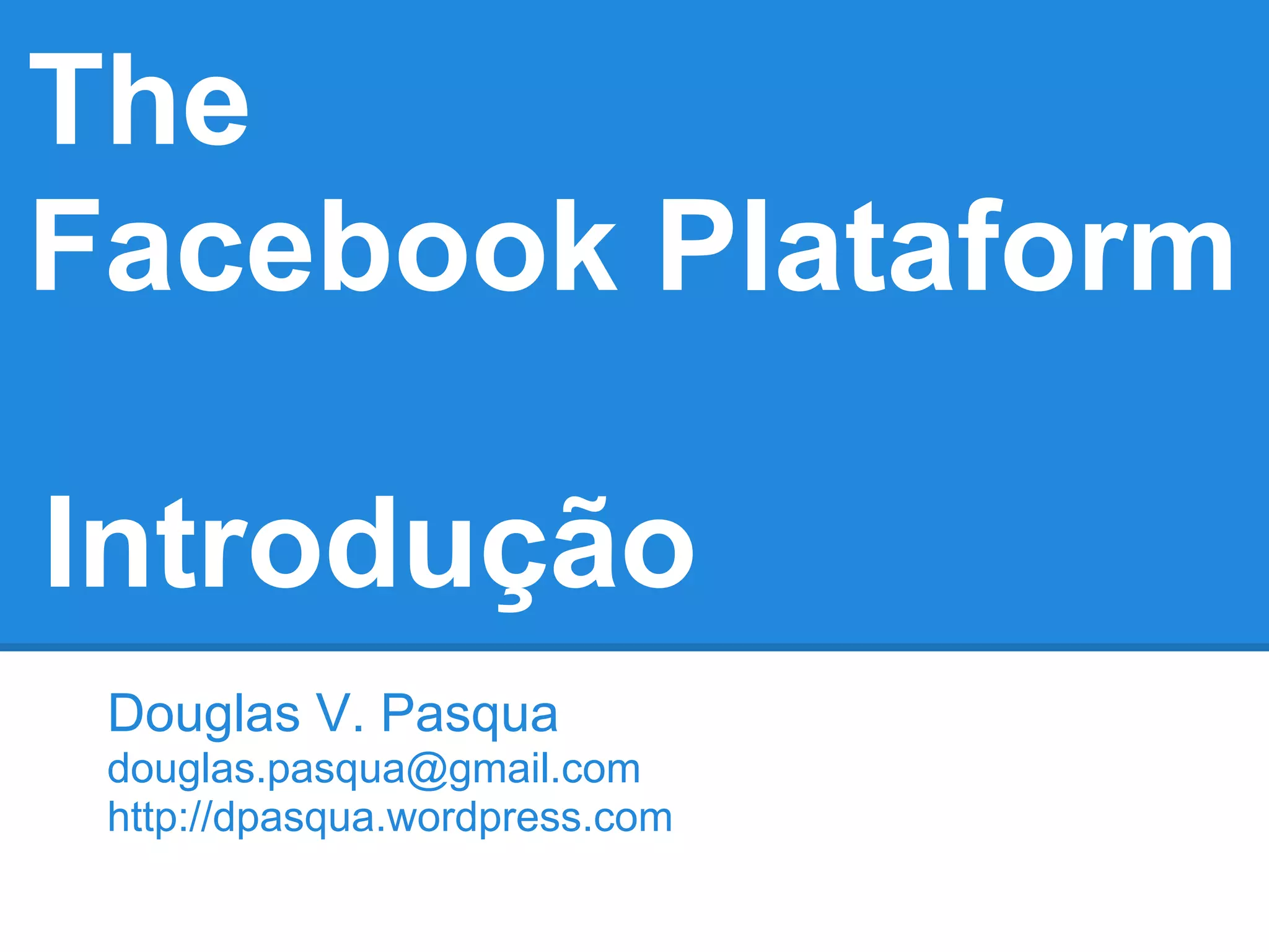 O documento descreve a Plataforma do Facebook, lançada em 2007, que permite desenvolvedores criarem aplicativos que acessam dados no Facebook através da Graph API. A Graph API representa o social graph do Facebook e permite ler e escrever dados através de requisições HTTP. A plataforma também inclui o Facebook Login, Plugins Sociais, iframes, Open Graph Protocol e SDKs para facilitar a integração de aplicativos.