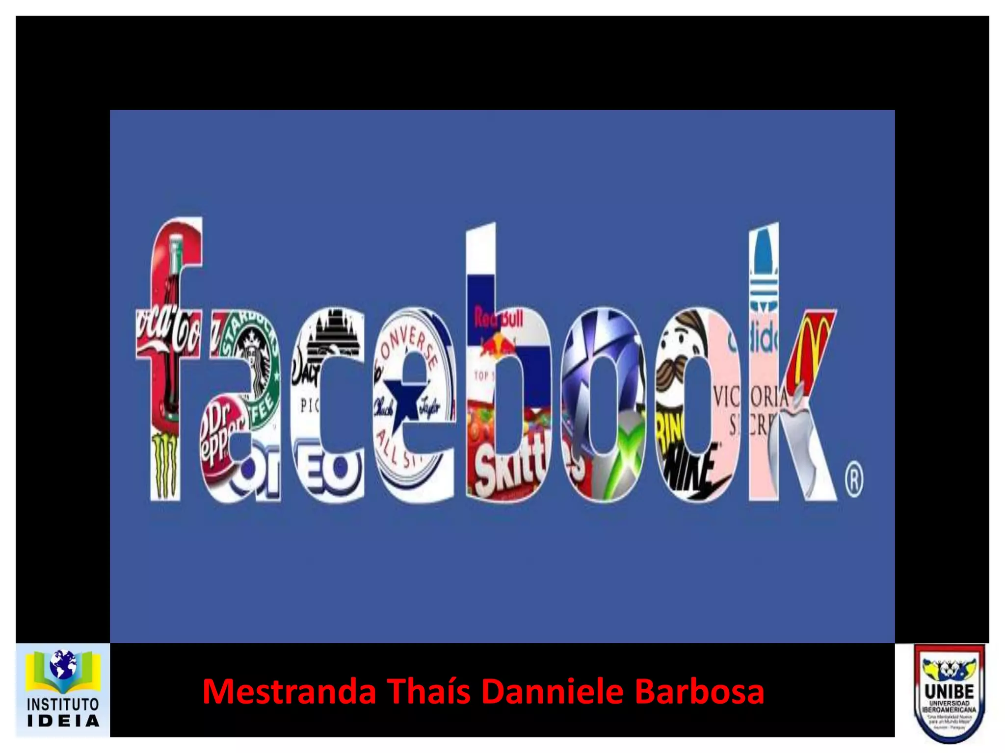 O documento discute o Facebook, definindo-o como uma rede social proprietária lançada em 2004. Ele lista conceitos, características, vantagens e desvantagens do Facebook, além de recomendações educativas e fontes bibliográficas.