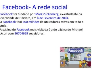 Facebook- A redesocial O Facebook foi fundado por Mark Zuckerberg , ex-estudante da Universidade de Harvard, em 4 de Fevereiro de 2004 . O Facebook tem 500 milhões de utilizadores ativos em todo o mundo. A página do Facebook mais visitada é a do página do Michael Jackson com 26704659 seguidores.