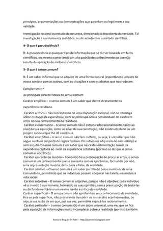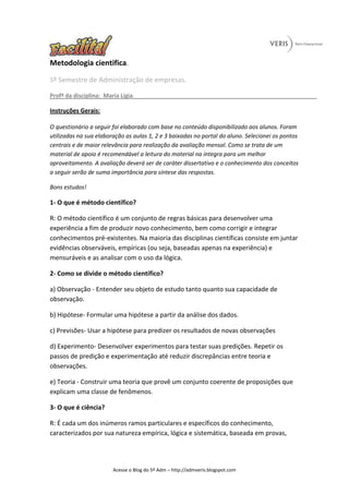 O documento apresenta os principais conceitos sobre metodologia científica ensinados em uma disciplina do 5o semestre de Administração. Ele define método científico, ciência, pseudociência e senso comum, e explica como o método científico é dividido em observação, hipótese, previsões, experimento e teoria.