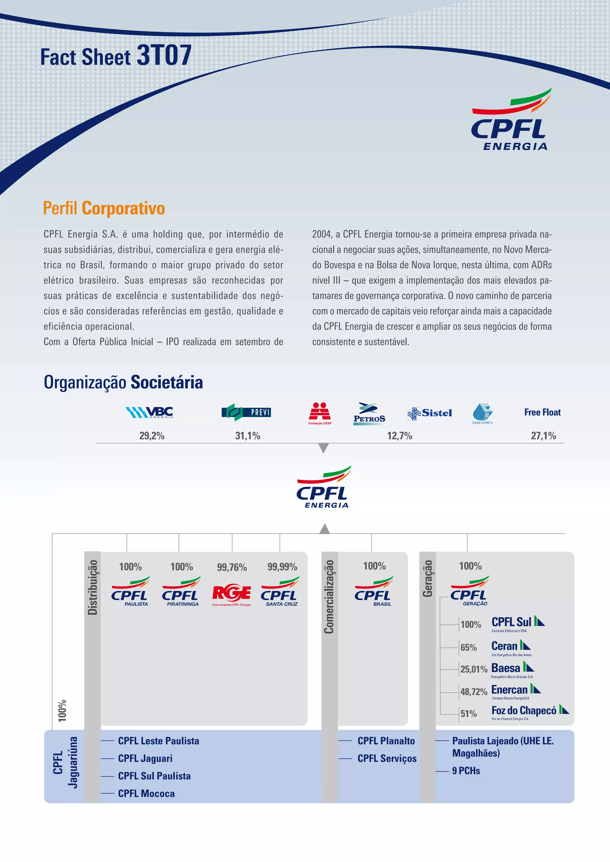 A CPFL Energia é a maior empresa privada do setor elétrico brasileiro, atuando na geração, distribuição e comercialização de energia. Sua atuação abrange vários estados brasileiros e ela é reconhecida pela excelência operacional. A empresa adota práticas avançadas de governança corporativa e sustentabilidade, buscando o crescimento consistente do negócio de forma responsável.