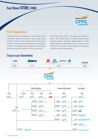 A CPFL Energia é uma holding que atua no setor elétrico brasileiro por meio de subsidiárias de distribuição, comercialização e geração de energia. Sua atuação abrange vários estados brasileiros e é reconhecida por excelência operacional. A empresa possui ações negociadas na bolsa brasileira e americana, sendo a primeira empresa privada brasileira a fazer isso.
