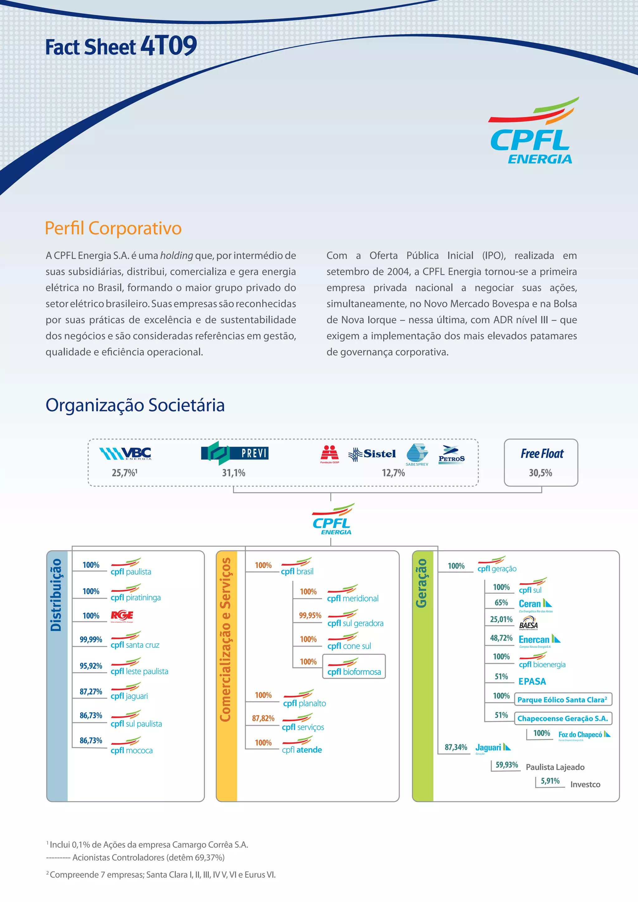 A CPFL Energia é a maior empresa privada do setor elétrico brasileiro, atuando na geração, distribuição e comercialização de energia. Sua estratégia de crescimento sustentável é baseada em excelência operacional, disciplina financeira e responsabilidade socioambiental. A empresa possui ações negociadas no Novo Mercado da B3 e na Bolsa de Nova York.