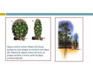 O documento discute a humidade e sua importância para os seres vivos. Classifica os seres vivos em quatro categorias com base em suas necessidades hídricas: hidrófilos, que vivem permanentemente na água; higrófilos, que vivem em locais úmidos; mesófilos, que têm necessidade moderada de água; e xerófilos, que vivem com pouca água. Também descreve adaptações de plantas e animais em climas secos, como raízes profundas, folhas reduzidas e re