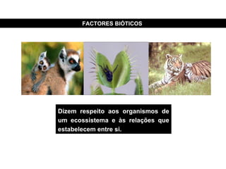 O documento descreve as principais relações bióticas que ocorrem entre organismos de uma mesma espécie ou de espécies diferentes. São descritas relações como predação, competição, parasitismo, mutualismo, simbiose, comensalismo e amensalismo. Também são abordadas relações intra-específicas como cooperação, competição e canibalismo.