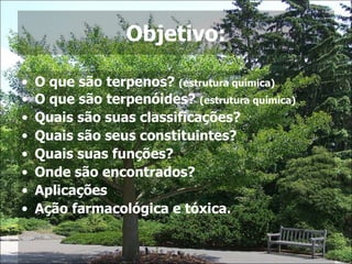Terpenos e terpenóides são compostos orgânicos encontrados em plantas. São classificados de acordo com o número de unidades de isopreno que os compõem. Possuem diversas funções para as plantas e para os seres humanos, como defesa, produção de vitaminas e ações antioxidante e anti-inflamatória. São encontrados em óleos essenciais de plantas e aplicados na indústria farmacêutica e de cosméticos.