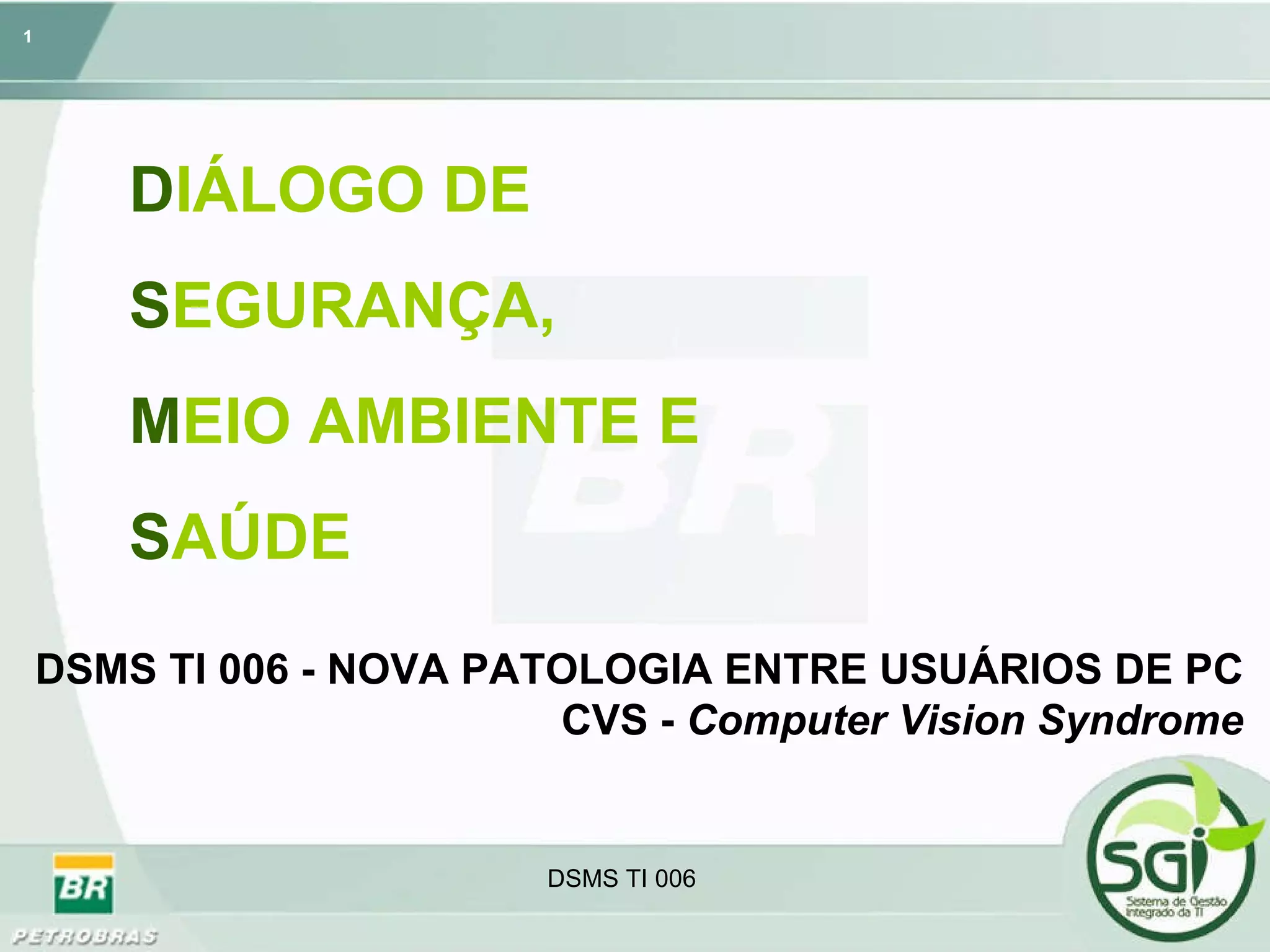 O documento discute a Síndrome Visual do Usuário de Computador (CVS), que afeta entre 70% e 90% dos usuários de computadores e causa sintomas como dor de cabeça, olhos vermelhos e secos. Ele explica que a CVS ocorre devido à falta de movimento dos olhos e piscar enquanto se usa o computador, sobrecarregando a visão. O texto fornece dicas para reduzir os sintomas da CVS, como manter o monitor a uma distância e ângulo adequados dos olhos e fazer pausas frequentes