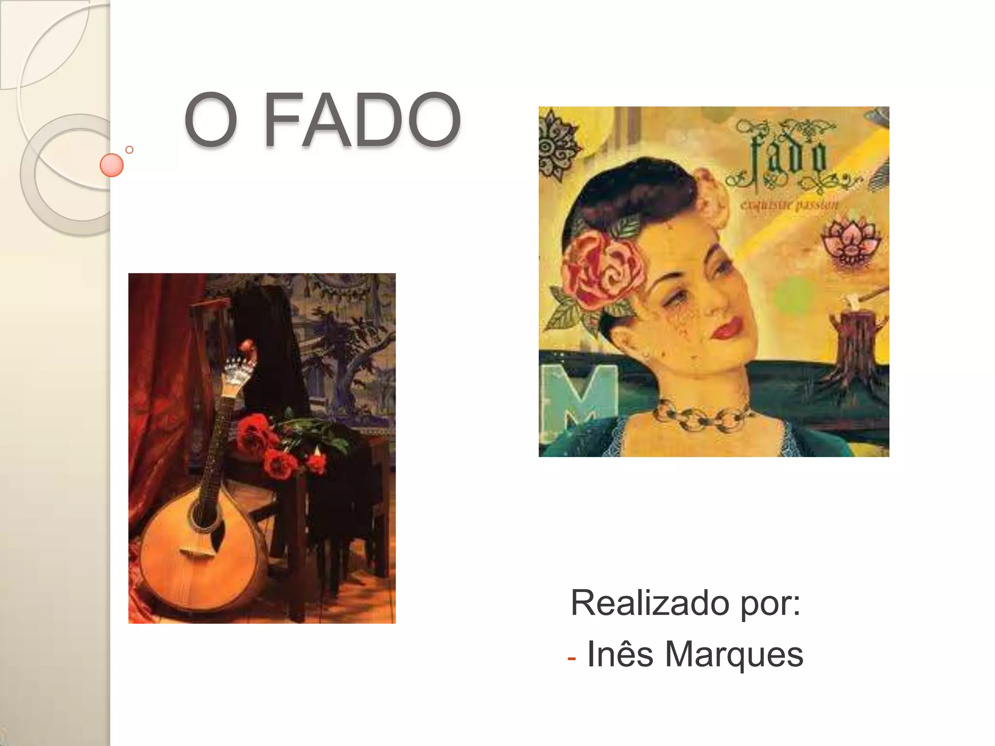 O documento descreve o fado como um estilo musical português tradicionalmente cantado com acompanhamento de guitarra clássica e guitarra portuguesa. Detalha a história do fado em Lisboa e Coimbra, os principais tipos de fado, e alguns dos fadistas mais importantes como Amália Rodrigues e Carlos do Carmo.