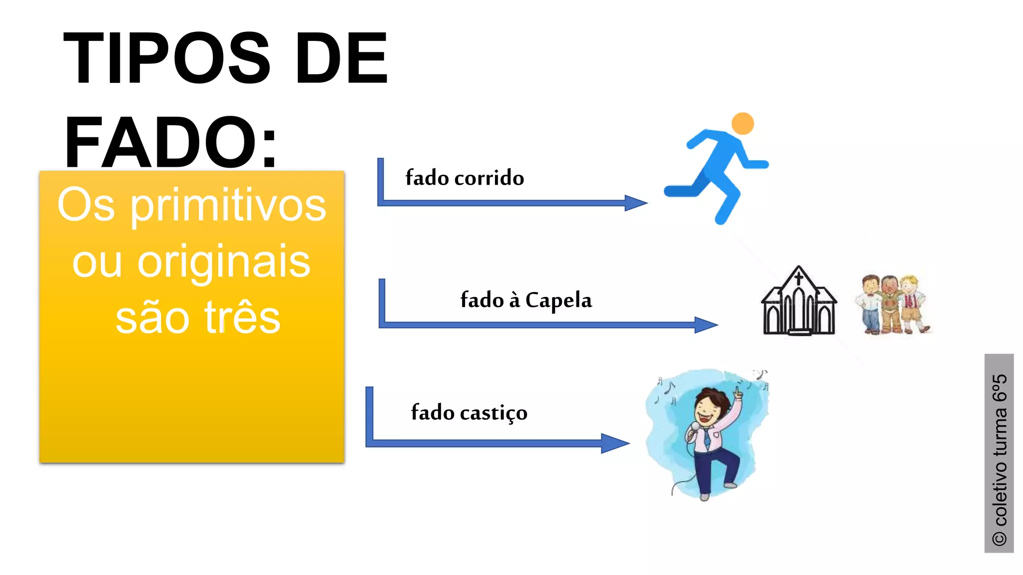 Há três tipos originais de fado - fado à Capela, fado corrido e fado castiço. O fado geralmente é interpretado por um fadista em pé com um guitarrista e violista sentados, embora existam cerca de 140 tipos diferentes de fado incluindo Tango, Franklin e outros.