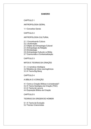 1. O documento é um resumo sobre o capítulo 1 de um curso de antropologia geral e cultural.