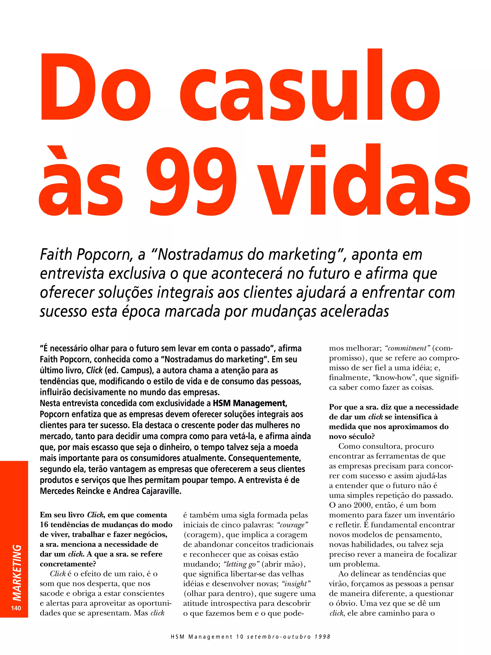 1) A entrevista discute as tendências de mercado e mudanças de estilo de vida identificadas por Faith Popcorn em seu livro "Click". Popcorn argumenta que as empresas precisam oferecer soluções integrais aos clientes para ter sucesso nesse período de rápidas mudanças.