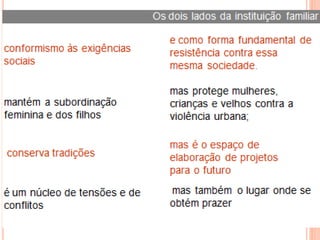 O documento discute a transformação da família moderna a partir da família pré-moderna, onde os indivíduos estão menos referenciados à família e mais livres para fazer escolhas pessoais. Também aborda como a inserção feminina no mercado de trabalho levou a novas divisões de tarefas domésticas e de cuidados com os filhos entre homens e mulheres.