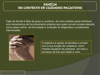 O documento discute o papel da família no contexto dos cuidados paliativos, definindo família e vendo-a como a unidade de cuidado. A doença terminal causa medo e confusão nos familiares, e a equipe deve ajudá-los a lidar com o luto de forma acompanhada e recuperar a confiança no processo. As famílias passam por etapas como negação, raiva e aceitação ao lidar com a perda de um ente querido.