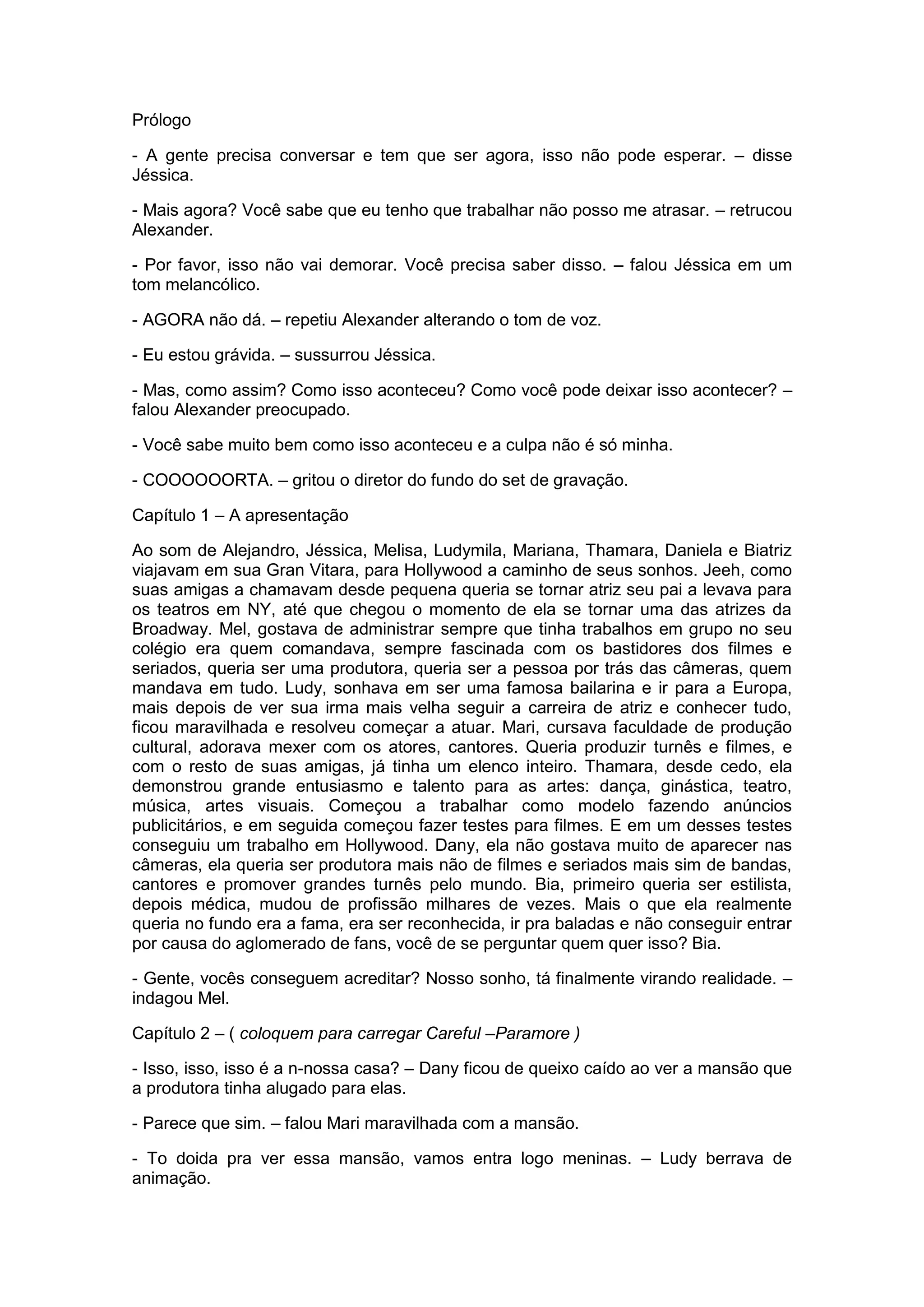 Prólogo<br />- Agente precisa conversar e tem que ser agora, isso não pode esperar. – disse Jéssica.<br />- Mais agora? Você sabe que eu tenho que trabalhar não posso me atrasar. – retrucou Alexander.<br />- Por favor, isso não vai demorar. Você precisa saber disso. – falou Jéssica em um tom melancólico.<br />- AGORA não dá. – repetiu Alexander alterando o tom de voz.<br />- Eu estou grávida. – sussurrou Jéssica.<br />- Mas, como assim? Como isso aconteceu? Como você pode deixar isso acontecer? – falou Alexander preocupado.<br />- Você sabe muito bem como isso aconteceu e a culpa não é só minha.<br />- COOOOOORTA. – gritou o diretor do fundo do set de gravação.<br />Capítulo 1 – A apresentação <br />Ao som de Alejandro, Jéssica, Melisa, Ludymila, Mariana, Thamara, Daniela e Biatriz viajavam em sua Gran Vitara, para Hollywood a caminho de seus sonhos. Jeeh, como suas amigas a chamavam desde pequena queria se tornar atriz seu pai a levava para os teatros em NY, até que chegou o momento de ela se tornar uma das atrizes da Broadway. Mel, gostava de administrar sempre que tinha trabalhos em grupo no seu colégio era quem comandava, sempre fascinada com os bastidores dos filmes e seriados, queria ser uma produtora, queria ser a pessoa por trás das câmeras, quem mandava em tudo. Ludy, sonhava em ser uma famosa bailarina e ir para a Europa, mais depois de ver sua irma mais velha seguir a carreira de atriz e conhecer tudo, ficou maravilhada e resolveu começar a atuar. Mari, cursava faculdade de produção cultural, adorava mexer com os atores, cantores. Queria produzir turnês e filmes, e com o resto de suas amigas, já tinha um elenco inteiro. Thamara, desde cedo, ela demonstrou grande entusiasmo e talento para as artes: dança, ginástica, teatro, música, artes visuais. Começou a trabalhar como modelo fazendo anúncios publicitários, e em seguida começou fazer testes para filmes. E em um desses testes conseguiu um trabalho em Hollywood. Dany, ela não gostava muito de aparecer nas câmeras, ela queria ser produtora mais não de filmes e seriados mais sim de bandas, cantores e promover grandes turnês pelo mundo. Bia, primeiro queria ser estilista, depois médica, mudou de profissão milhares de vezes. Mais o que ela realmente queria no fundo era a fama, era ser reconhecida, ir pra baladas e não conseguir entrar por causa do aglomerado de fans, você de se perguntar quem quer isso? Bia.<br />- Gente, vocês conseguem acreditar? Nosso sonho, tá finalmente virando realidade. – indagou Mel.<br />Capítulo 2 – ( coloquem para carregar Careful –Paramore )<br />- Isso, isso, isso é a n-nossa casa? – Dany ficou de queixo caído ao ver a mansão que a produtora tinha alugado para elas.<br />- Parece que sim. – falou Mari maravilhada com a mansão.<br />- To doida pra ver essa mansão, vamos entra logo meninas. – Ludy berrava de animação.<br />Desceram todas do carro e adentraram na casa. Quando entraram deram de cara com um hall e uma escada em sua frente. A sua esquerda tinha uma sala enorme com a parede de trás constituída de vidro, com uma vista para um jardim com uma piscina enorme. A sua direita, uma linda conzinha toda de inox com uma mesa de oito lugares. Subindo a escada, tinha um corredor enorme, com aparentemente sete quartos todos suítes, com camas de casal, escrivaninha, tudo o que tinham direito.<br />- Meninas, nós todas precisamos de um banho e depois ir para os estúdios né? – Bia falava enquanto entrava em seu quarto.<br />- 20 minutos, tá bom né? – arfou Tha.<br />Todas prontas, entraram no carro pegaram o endereço e foram direto para a produtora. Chegando lá, estacionaram o carro e foram falar com a recepcionista.<br />Dany’s POV<br />Caralho, que lugar gigante. A produtora, onde tinham os estúdios e tudo mais era gigante, parecia sonho não dava pra acreditar que e minhas melhores amigas estavam ali, tipo como assim? As 7 conseguirem passar nos testes para o trabalho que tanto sonhavam. Era de tirar o fôlego, imagina eu, euzinha simples humana organizando uma mega turnê, pela Europa é esse sonho estava quase se realizando. De repente escuta uma voz ao fundo.<br />- Dany, Dany acorda. – Bia me chamando pra realidade. – Dá seu RG e CPF pra recepcionista terminar seu formulário.<br />- Ah tá, aqui. – abri a bolsa procurando pela minha carteira e entreguei minha identidade para a mulher loira desbotada que estava sentada atrás do balcão.<br />Bom, o que eu estava falando mesmo? Ah sim, como meus sonhos estão se realizando. E agora, é só seguir em frente a caminho das minhas realizações.Ai eu preciso ir ao banheiro imediatamente.<br />- Moça, aonde é o banheiro, por favor? – perguntei a loira.<br />- Entre naquela porta e vire a esquerda.<br />Peguei minha bolsa e fui direto para o banheiro, fui andando lentamente olhando para as fotos na parede, quando esbarrei em alguém, um homem bem bonito por sinal e eu já o tinha visto nas telas de televisão, eu não acredita que Raoul Bova estava na minha frente. Puta merda. ( dêem play na música )<br />I settle down<br />( Eu sossego )<br />A twisted up frown<br />( Um olhar de desdém distorcido )<br />Disguised as a smile<br />( Disfarçado como um sorriso )<br />Well, you would've never known<br />( Bem, você jamais saberia )<br />I had it all, but not what I wanted<br />( Que eu tinha tudo, mas não o que eu queria )<br />'Cause hope for me was a place uncharted<br />( Porque a esperança para mim era um lugar desconhecido )<br />And overgrown<br />( E com muito mato )<br />- D-Desculpa, eu estava distraída. – IDIOTA, LERDA um gato desses na sua frente, esbarra em você, e você gageja? Ai, como eu sou idiota, caralho x.x<br />- Não se preocupa, eu também não estava prestando atenção. <br />You make your way in<br />( Você faz o seu caminho para entrar )<br />I'd resist you just like this<br />( Eu resisti a você assim )<br />