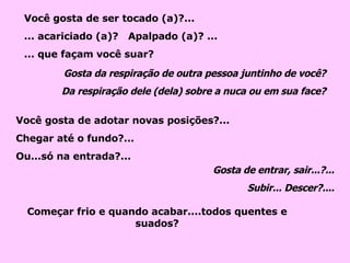 Você gosta deser tocado (a)?... ... acariciado (a)? Apalpado (a)? ... ... que façam você suar? Gosta da respiração de outra pessoa juntinho de você? Da respiração dele (dela) sobre a nuca ou em sua face? Você gosta de adotar novas posições?... Chegar até o fundo?... Ou...só na entrada?... Gosta de entrar, sair...?... Subir... Descer?.... Começar frio e quando acabar....todos quentes e suados?