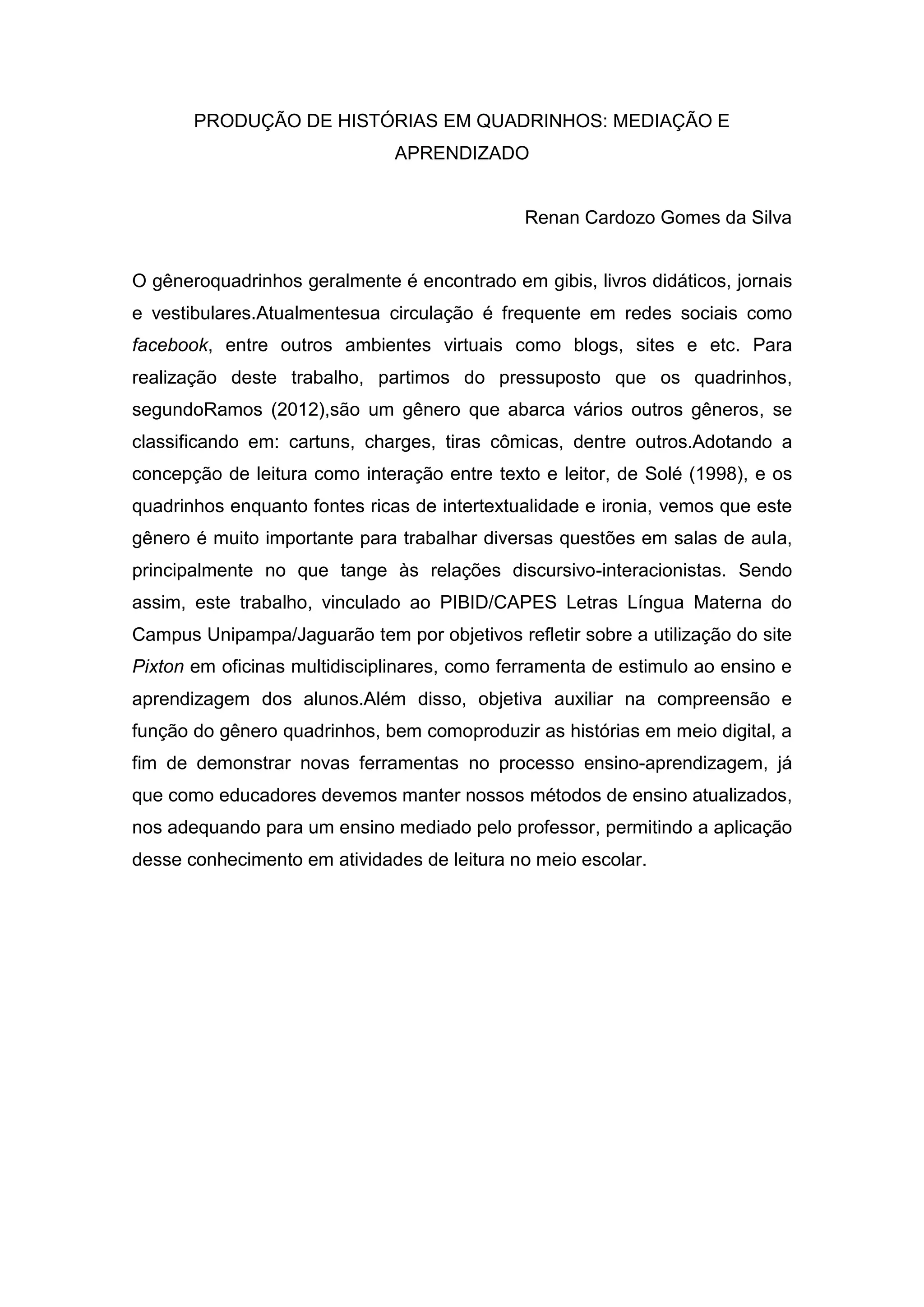 Este documento discute a utilização de histórias em quadrinhos como ferramenta de ensino e aprendizagem. Ele explora como o site Pixton pode ser usado em oficinas multidisciplinares para estimular os alunos. Também objetiva auxiliar na compreensão do gênero quadrinhos e produzir histórias digitais para demonstrar novas ferramentas no processo de ensino-aprendizagem.