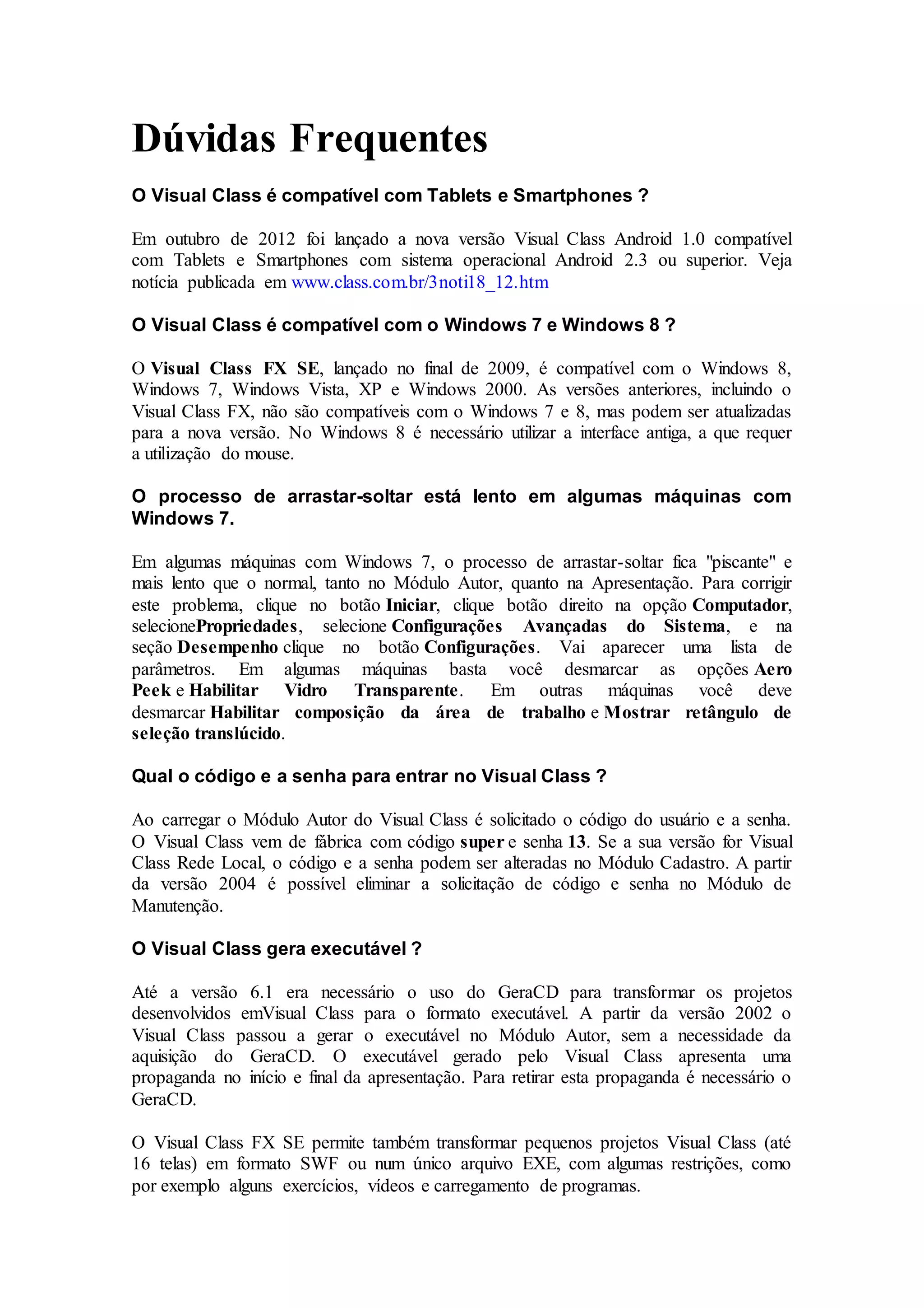 O documento fornece respostas para perguntas frequentes sobre o software Visual Class, abordando tópicos como compatibilidade, formatos de arquivo, publicação na web e requisitos técnicos.