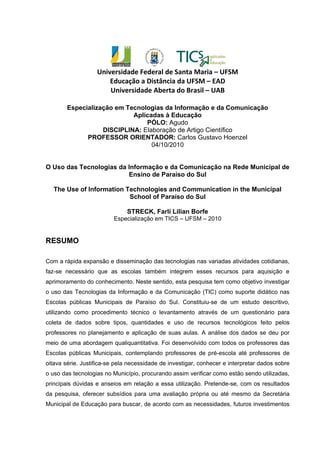 [1] O documento discute o uso das tecnologias da informação e comunicação (TIC) como ferramenta didática nas escolas públicas municipais de Paraíso do Sul.
