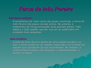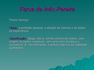 A farsa descreve a história de Inês Pereira, uma jovem ambiciosa que se casa para melhorar sua posição social, mas acaba infeliz sob o domínio de um marido tirânico. Ela reconhece seu erro, aprende com a experiência e planeja se vingar, eventualmente se casando com outro pretendente. Apesar de ser uma personagem específica, Inês representa uma lição universal sobre como a ambição e a imprudência podem levar à desgraça, e a importância de aprender com os erros.
