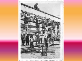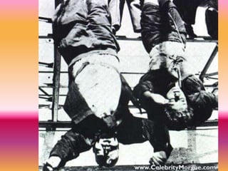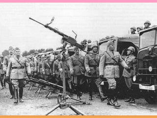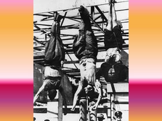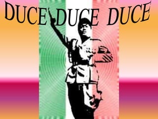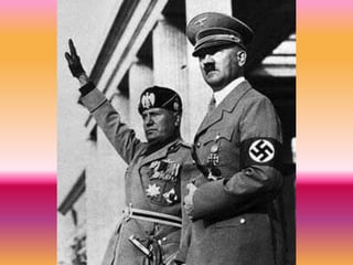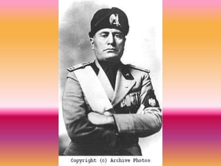 O documento descreve o fascismo italiano sob Mussolini, caracterizando-o como um regime totalitário de extrema-direita centrado no culto do chefe do Estado e na concentração de poderes. Detalha como Mussolini chegou ao poder e as principais características do seu governo, incluindo o nacionalismo, corporativismo e o desenvolvimento de obras públicas.