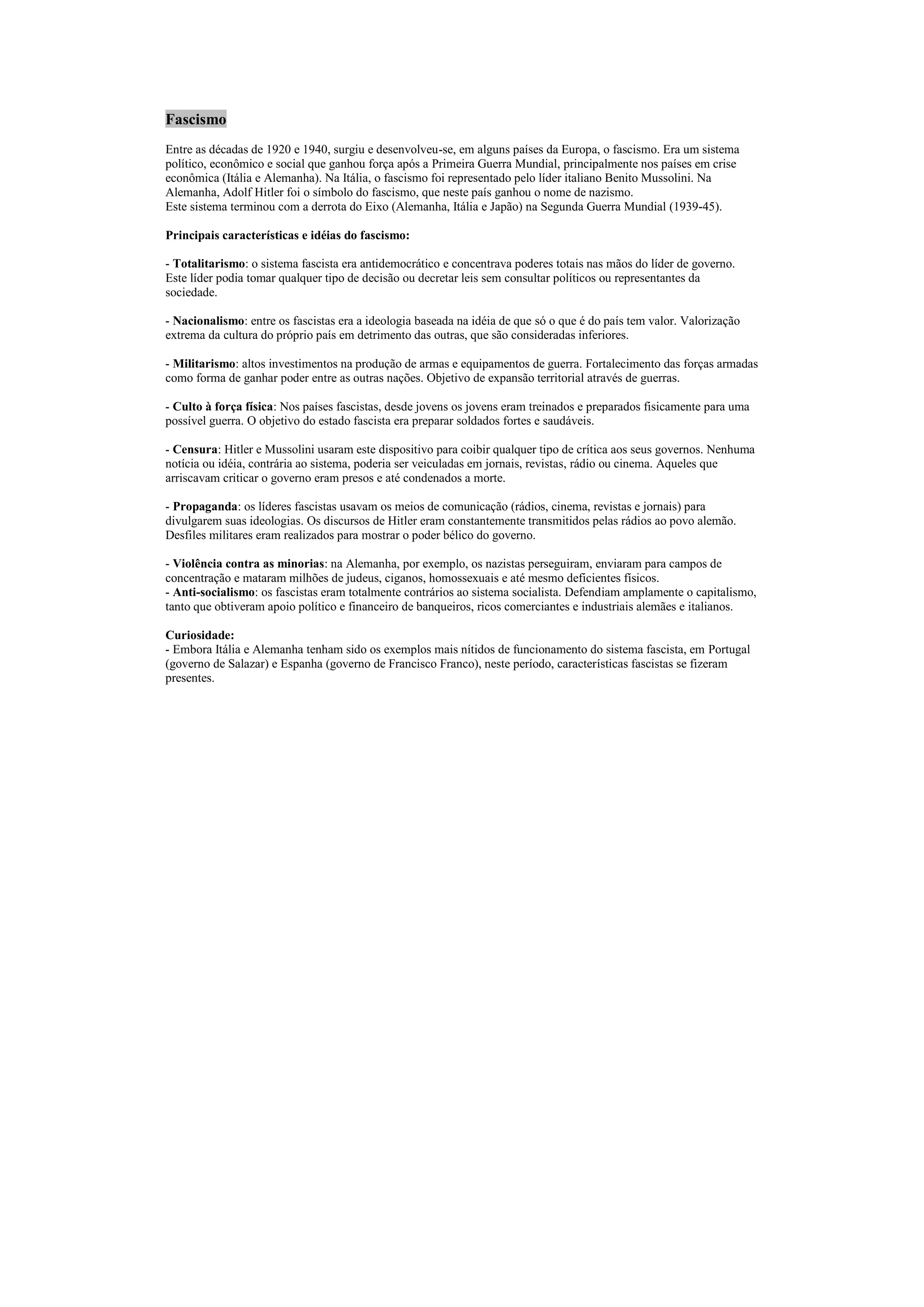 O fascismo surgiu na Europa entre as décadas de 1920 e 1940, notadamente na Itália sob Benito Mussolini e na Alemanha sob Adolf Hitler, como um sistema totalitário, nacionalista e militarista que colocava todo o poder nas mãos de um líder e promovia a propaganda e a censura. O fascismo foi derrotado com o fim do Eixo na Segunda Guerra Mundial.