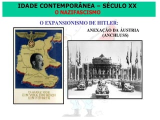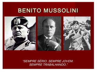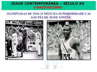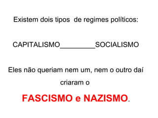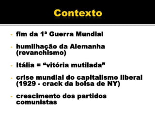 O documento descreve os regimes fascista e nazista na Itália e Alemanha respectivamente. O fascismo surgiu na Itália após a Primeira Guerra Mundial sob a liderança de Mussolini e se estabeleceu como uma ditadura. O nazismo surgiu na Alemanha após sua derrota na guerra sob a liderança de Hitler e também se estabeleceu como uma ditadura cruel. Ambos os regimes tinham características autoritárias e nacionalistas.