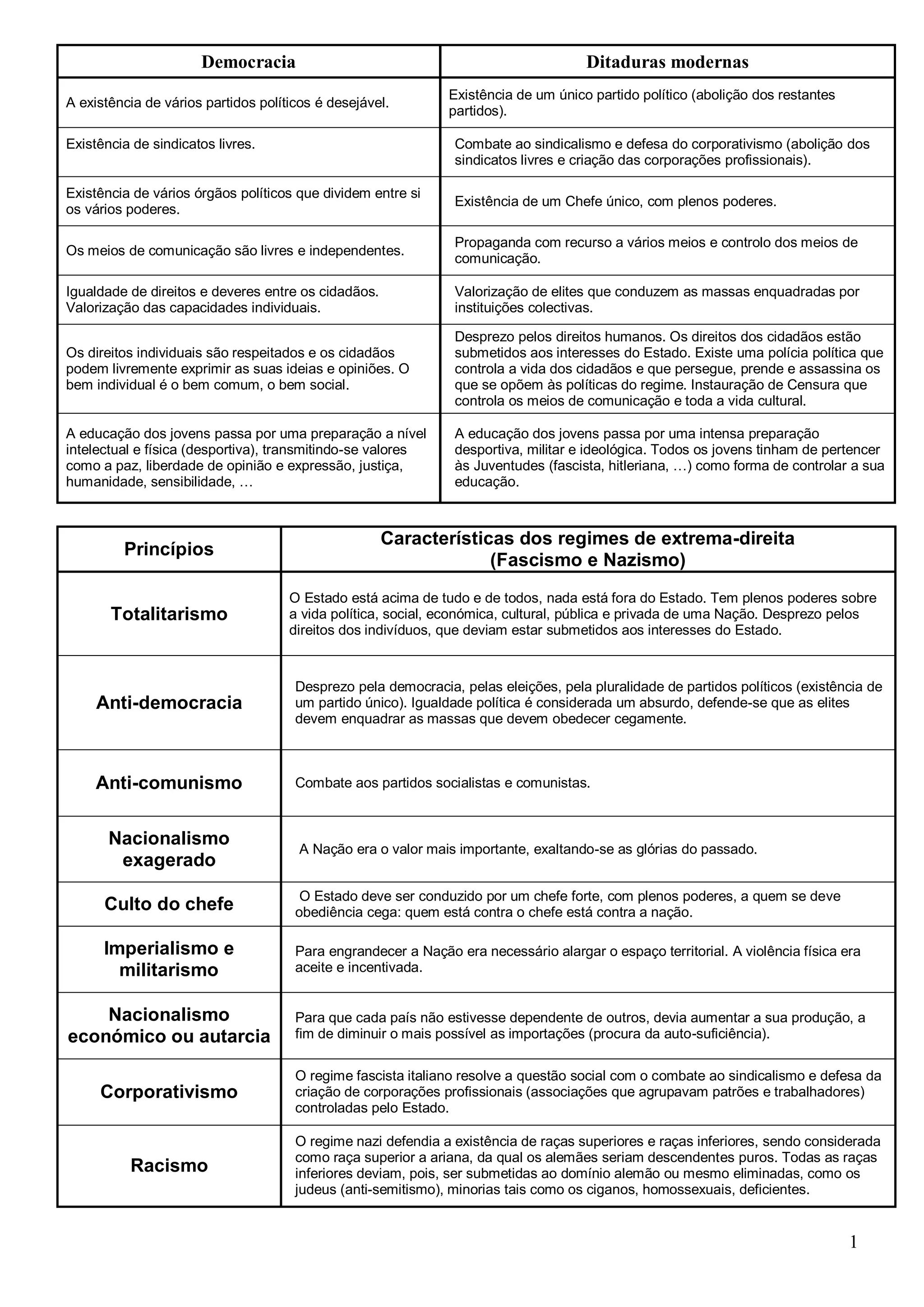As principais características das ditaduras de extrema-direita como o fascismo e o nazismo incluem o totalitarismo, a anti-democracia e o culto do chefe único com plenos poderes. Estes regimes também se caracterizam pelo nacionalismo exacerbado, militarismo, racismo e perseguição de opositores.