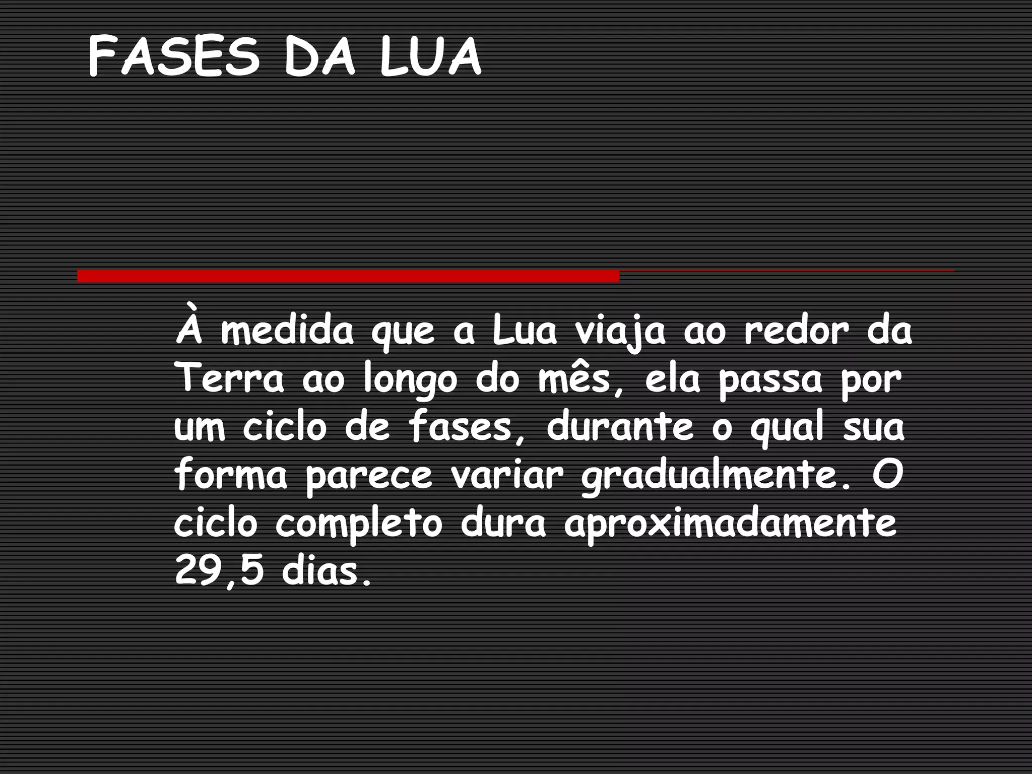 O documento explica as fases da Lua, descrevendo que a Lua passa por um ciclo de fases a cada 29,5 dias à medida que orbita a Terra, iluminando diferentes porções de sua face visível. As principais fases são Lua Nova, Quarto Crescente, Lua Cheia e Quarto Minguante.