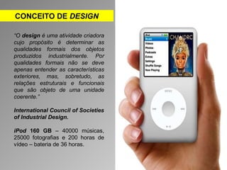 O documento discute o conceito e histórico do design, mencionando seus principais expoentes ao longo do tempo como Philippe Starck, Giorgio Giugiaro e Karim Rashid. Também aborda os diferentes estilos de design de moda em países como França, Itália, Japão e Brasil.