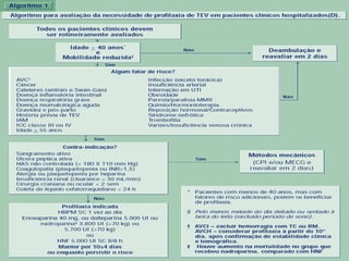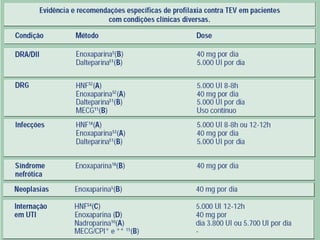 HNF 5000 USC 8/8h, iniciando 1-2h antes da cirurgia associada a CPI/meia elástica OU; Enoxoparina 40 mg SC 1-2h antes da cirurgia e 1x/dia no pós-operatório associada a CPI/meia elástica; Muito alto (1- cirurgias de grande porte em pacientes >40 a associado a TEV prévio, câncer ou hipercoagulabilidade; 2- pctes com múltiplos fatores de risco) HNF 5000 U SC 8/8h, iniciando 1-2h antes da cirurgia OU; Enoxoparina 40 mg SC 1-2h antes da cirurgia e 1x/dia no pós-operatório OU; Compressão pneumática intermitente iniciada imediatamente antes da cirurgia e mantida até a alta hospitalar Alto (pacientes que não se enquadram em nenhum dos outros 3 grupos) HNF 5000 U SC 12/12h, iniciando 1-2h antes da cirurgia OU; Enoxoparina 20 mg SC 1-2h antes da cirurgia e 1x/dia no pós-operatório OU; Meia elástica ou compressão pneumática intermitente iniciadas imediatamente antes da cirurgia e mantidas até a alta hospitalar Moderado (1- cirurgia de pequeno porte em pcte com fatores de risco; 2- cirurgia de porte intermediário em pctes entre 40-60 a sem fatores de risco, 3- cirurgias de grande porte em pacientes <40 a e sem fatores de risco) Mobilização precoce Baixo (cirurgia de pequeno porte, pcte<40 a, sem fatores de risco) Conduta Risco para TEV
