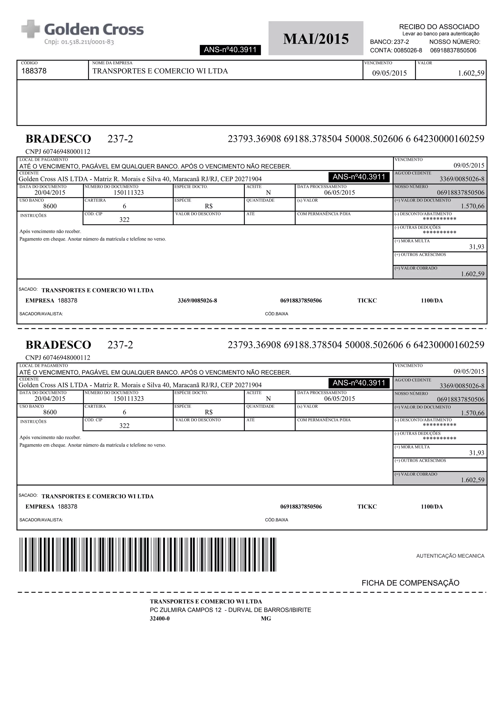 Este recibo é para o pagamento de R$1.602,59 devido em 09/05/2015 pela empresa Transportes e Comércio WI LTDA à Golden Cross AIS LTDA pelo serviço prestado. O recibo contém instruções para pagamento em cheque até a data de vencimento em qualquer banco ou após essa data.